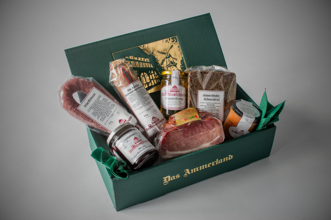 Feines Ammerländer Genuss-Paket – Deftige Spezialitäten im Präsentkarton Ein echtes Highlight für Liebhaber herzhafter Spezialitäten:...
