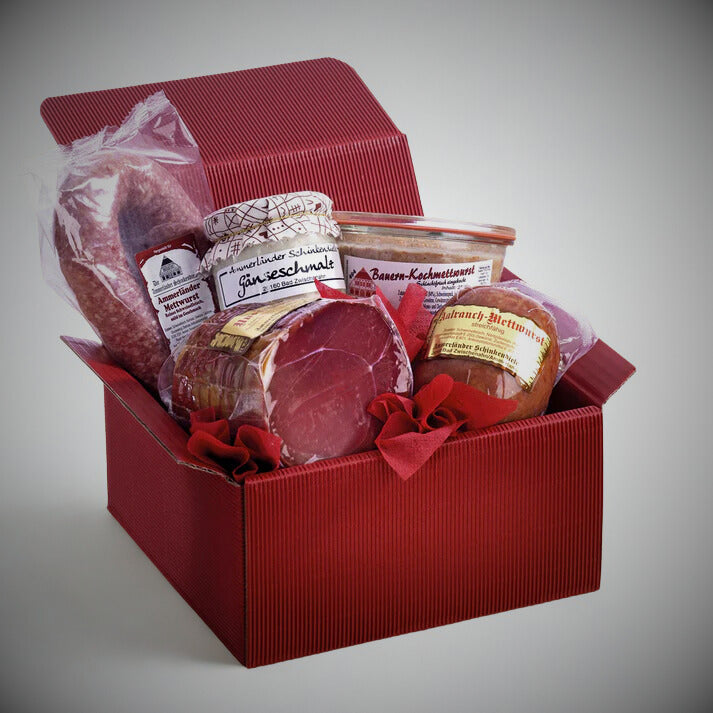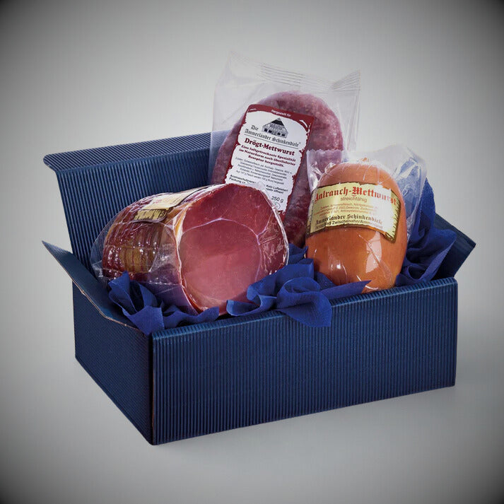 Inhalt des Präsents: Landschinken, luftgetrocknet (ca. 500g) Die kleine Sommermettwurst (350g) Tomatenleberwurst (180g) Verpackt in...